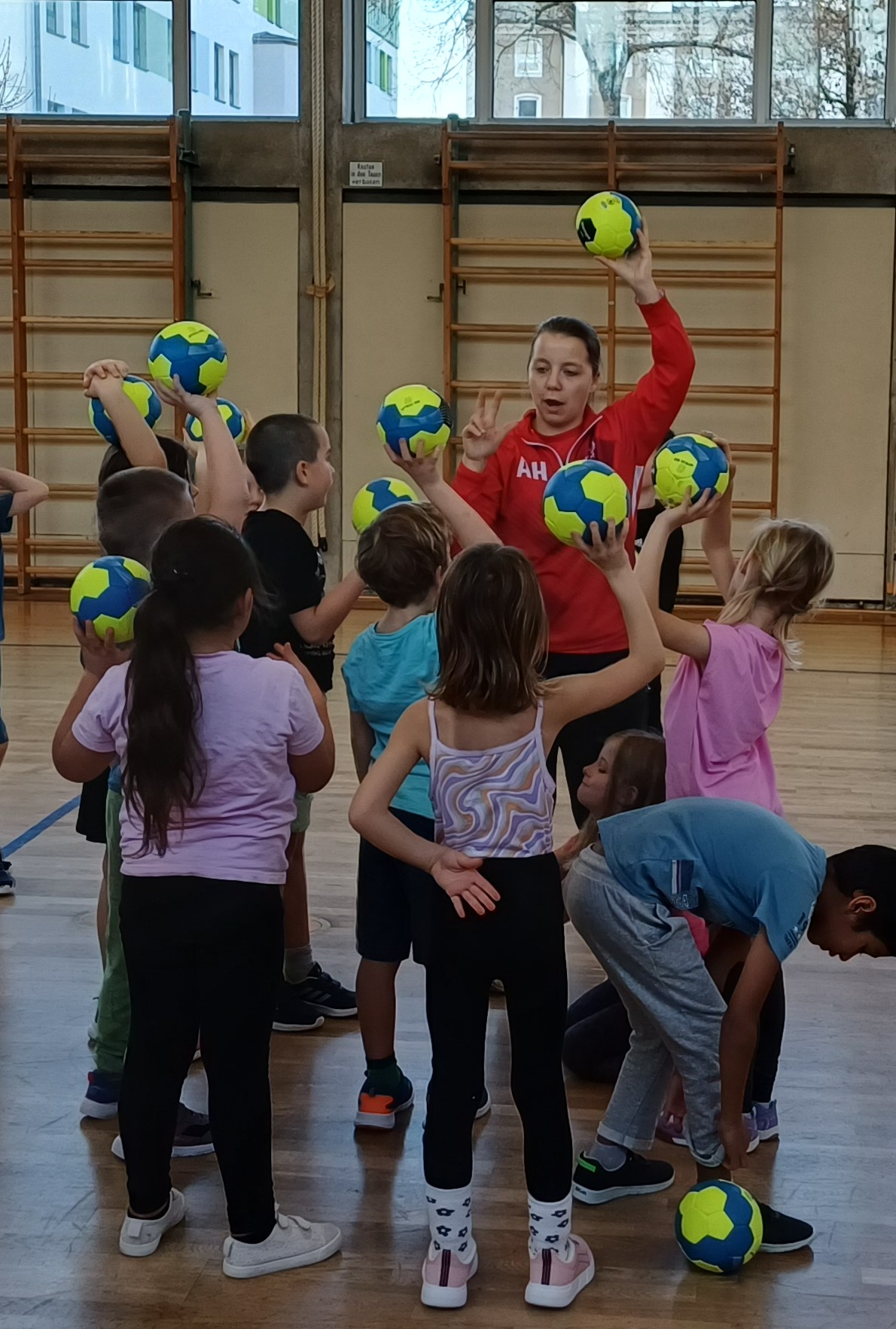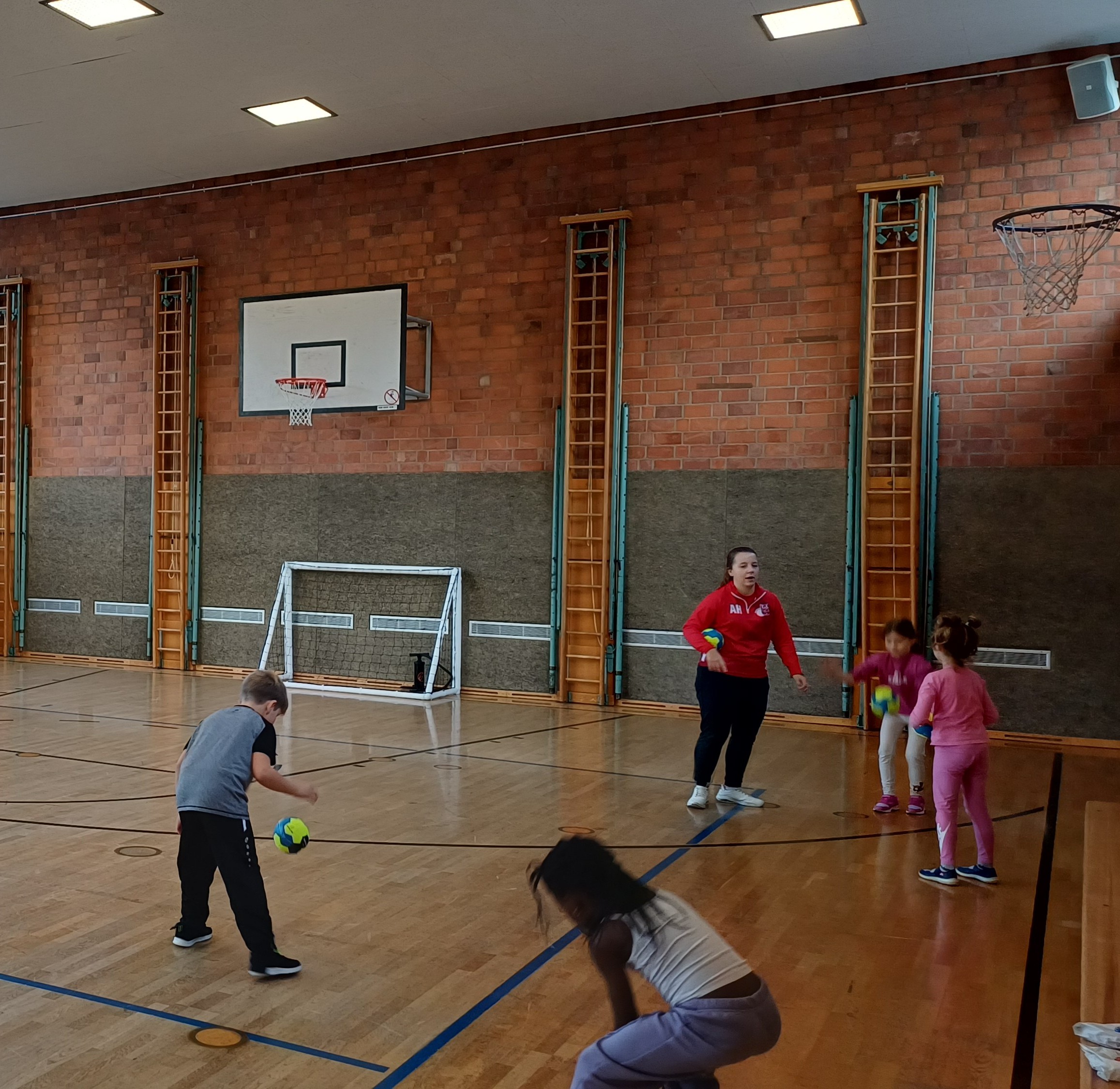 Der 8.Dezember 2025 stand für alle Erstklässler ganz im Zeichen des Handballsports. Der Deutsche Handballbund rief auf zu einem Handballaktionstag an Grundschulen und mit der TG MIPA Landshut Handball fand unsere Schule den perfekten Partnerverein. Anna Frank und Johannes Boerboom kamen zu den ersten Klassen, bepackt mit Bällen, aufblasbarem Tor und vor allem vielen tollen Spielideen. 60 Minuten pro Klasse durften die Kinder prellen, passen, werfen und den Handballsport kennenlernen. Als Belohnung für den fleißigen Einsatz gab es zum Abschluss für jedes Kind noch einen Teilnahmepass und sogar eine Einladung zu einem Heimspiel der Herren-Handballmannschaft. Die Schule bekam zudem 30 Kinderhandbälle geschenkt. Vielen Dank dafür an den Förderverein des Handballsports der Turngemeinde Landshut e. V.