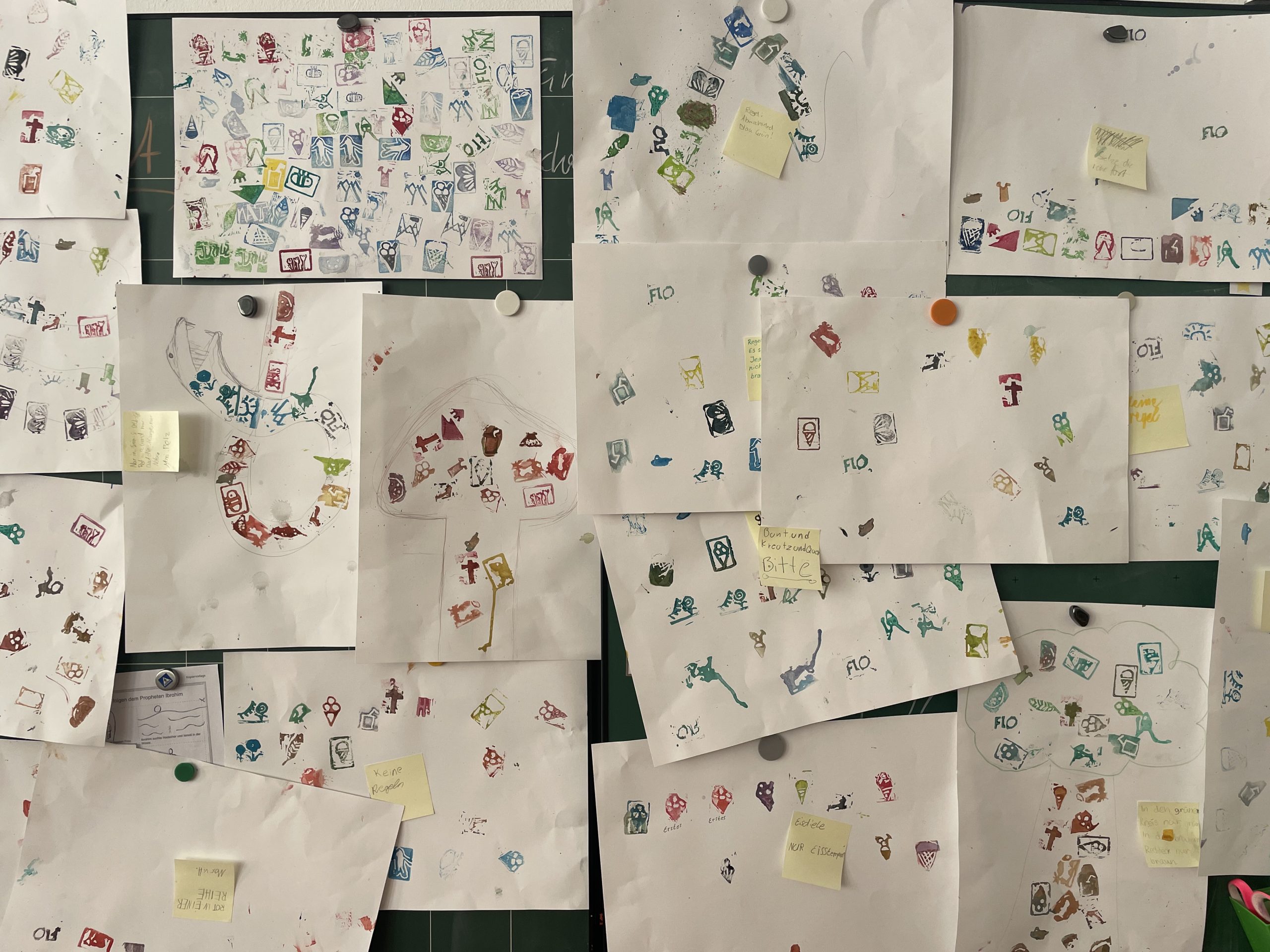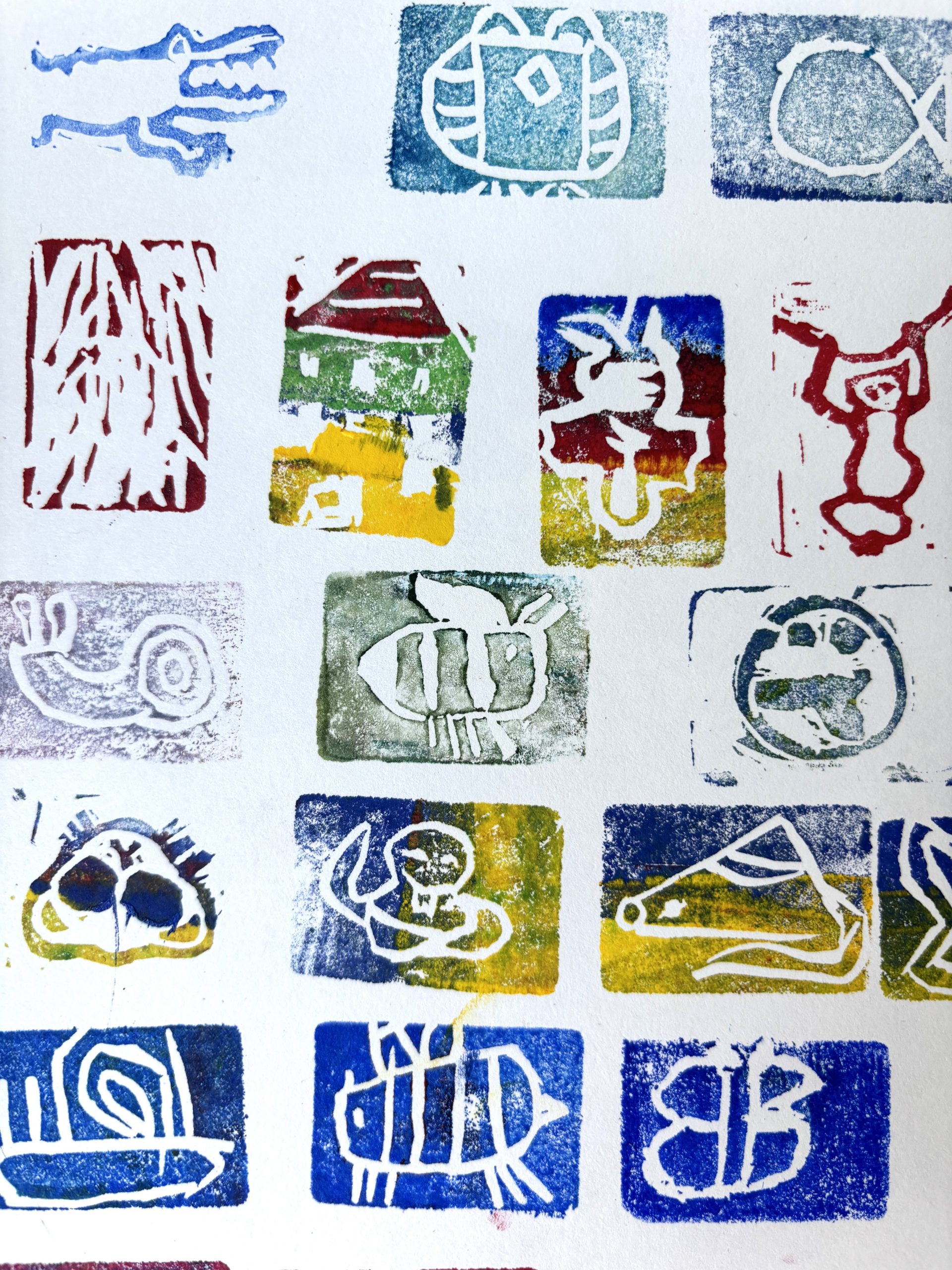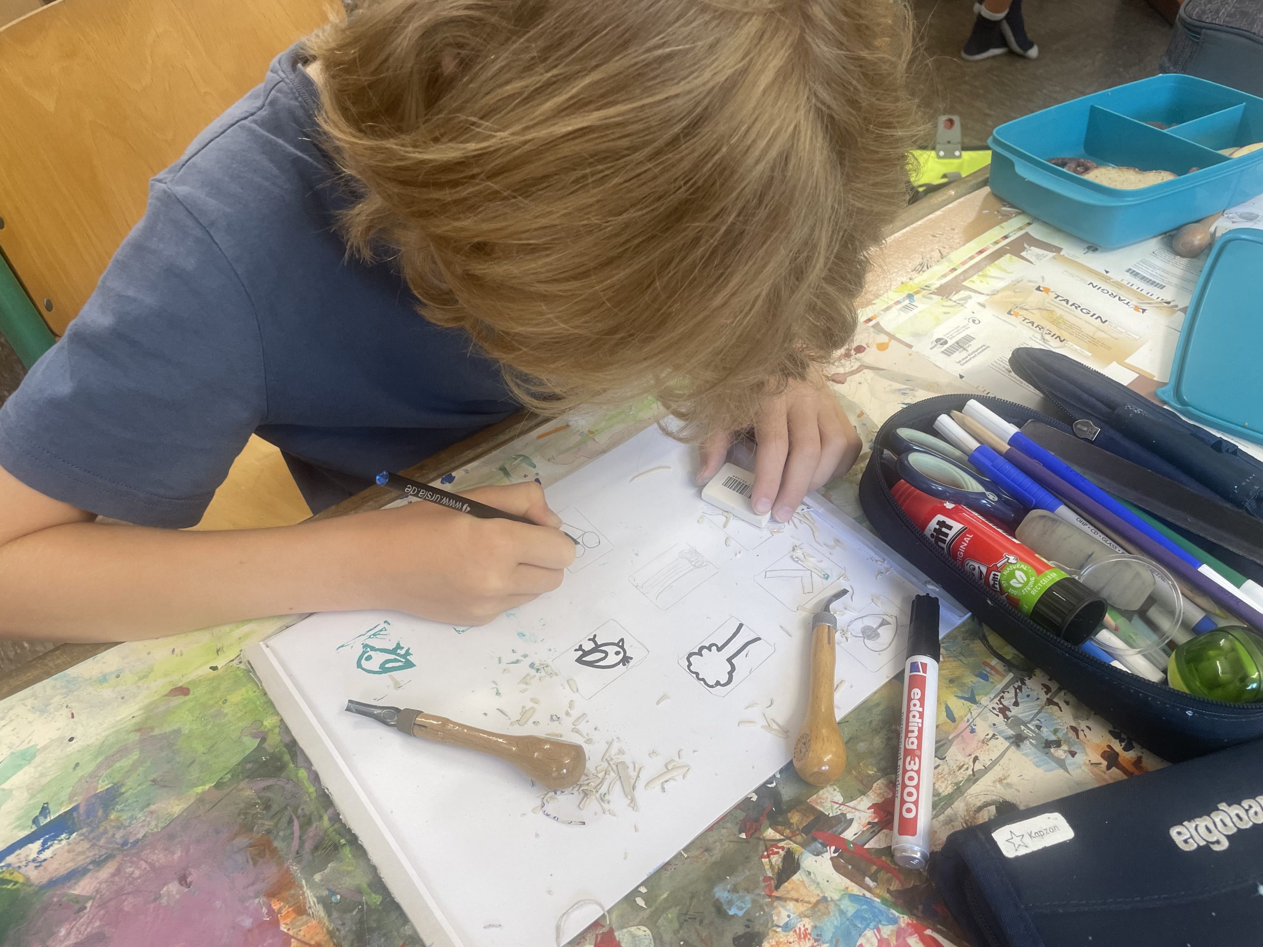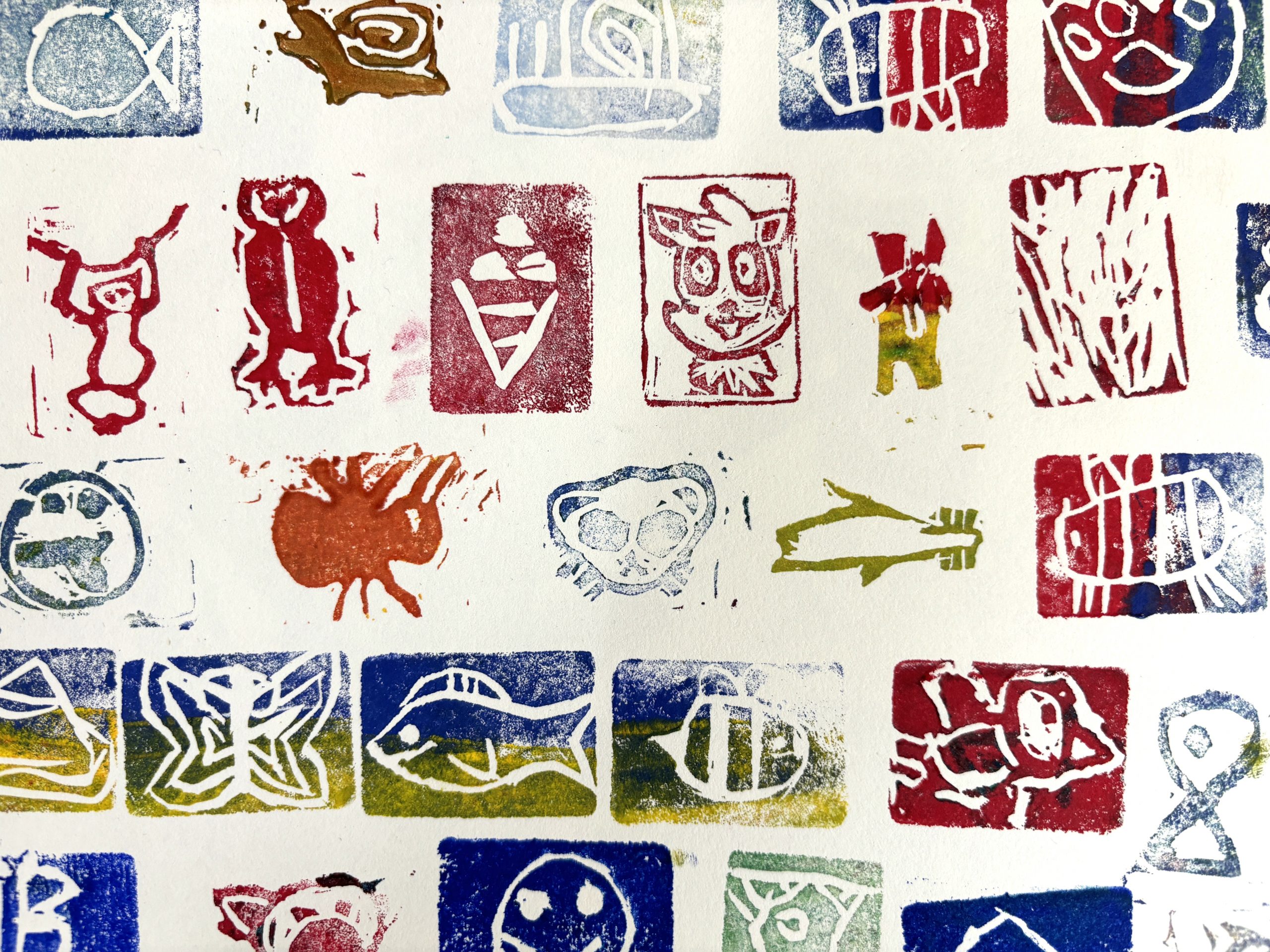 Diese wurden mit Linolschnitt-Werkzeugen aus herkömmlichen Radiergummis geschnitzt, auf Holzgriffe geleimt und sogleich ausprobiert. Alle waren begeistert von den detaillierten und bunten Ergebnissen!