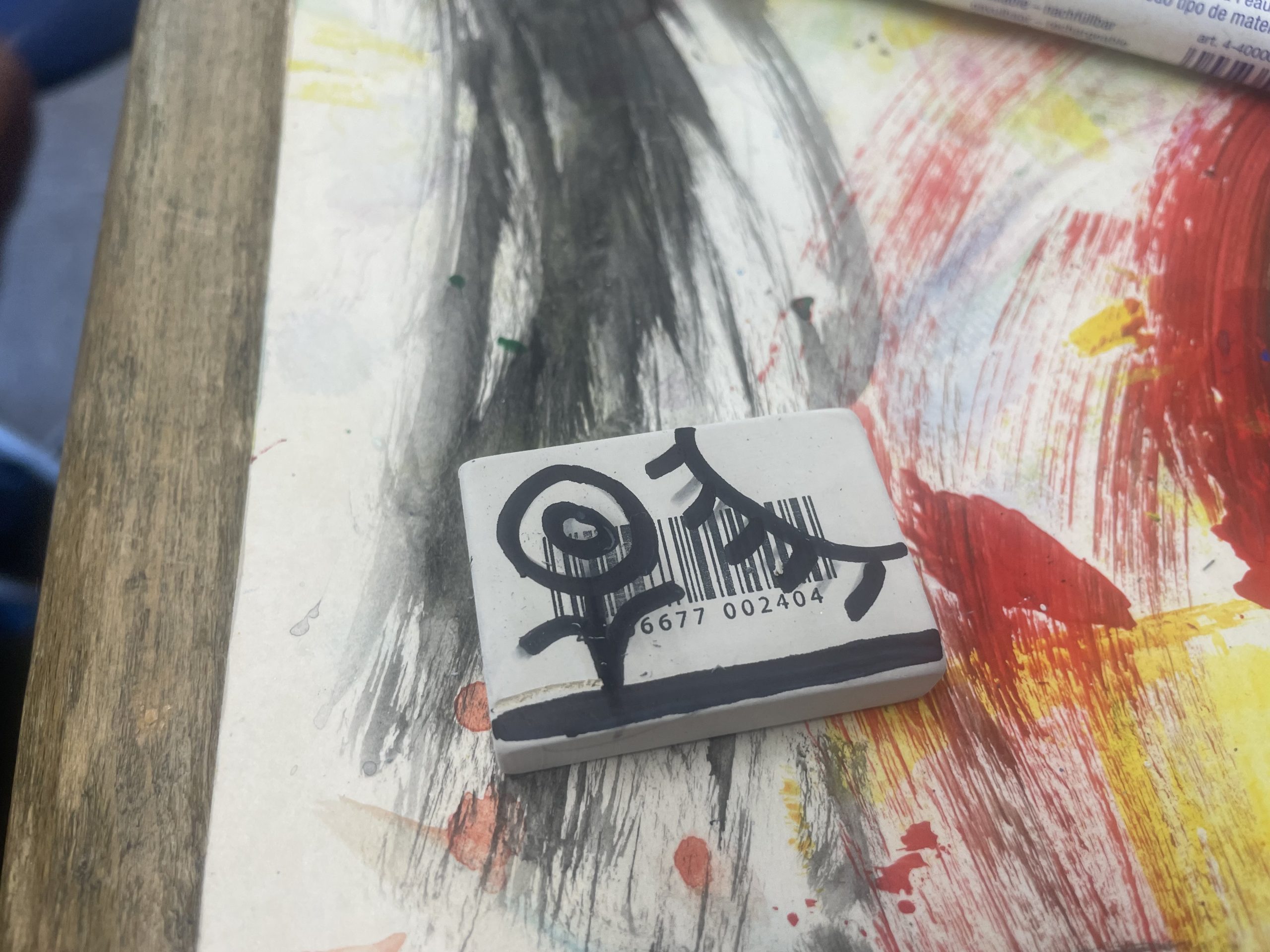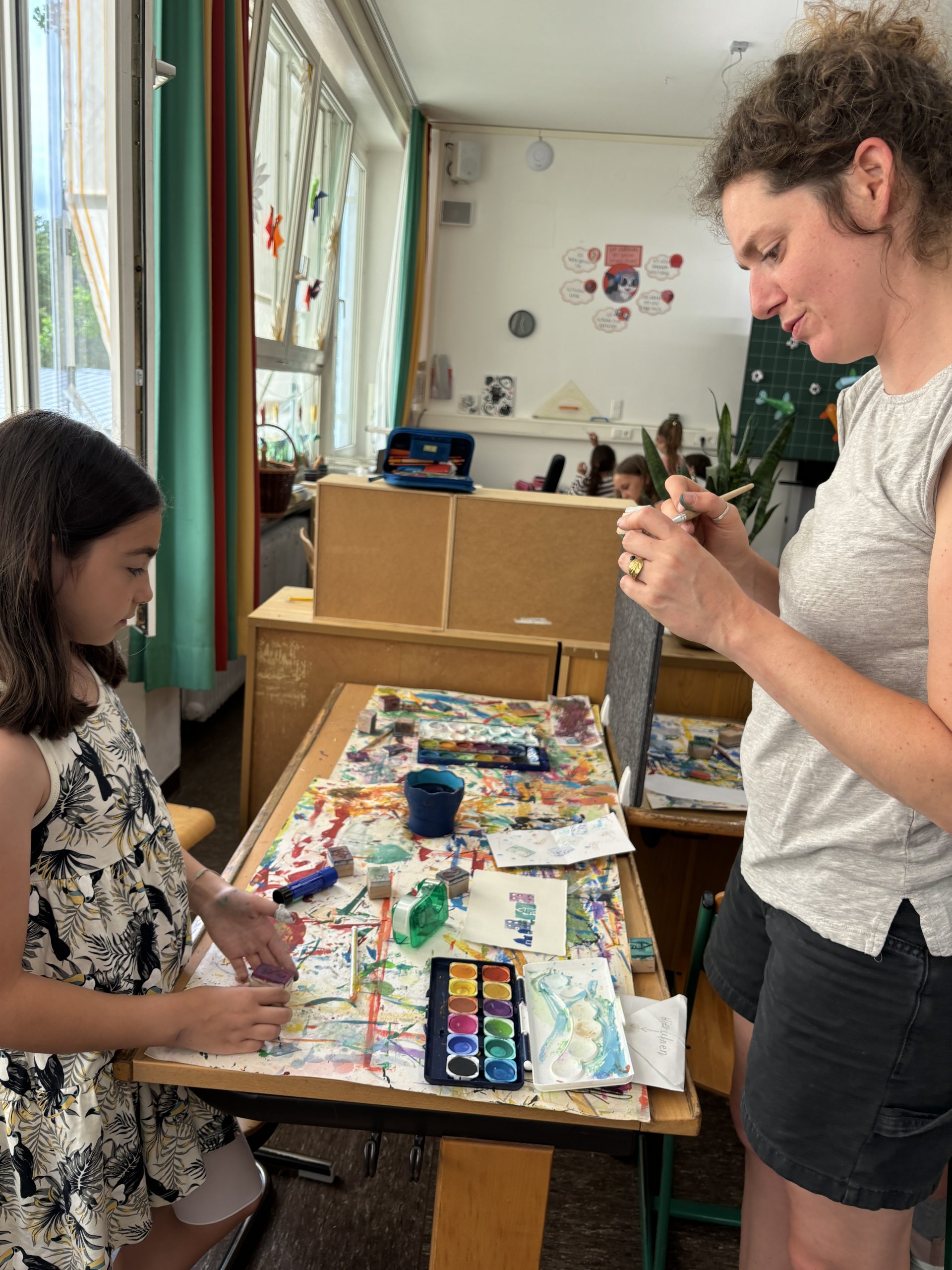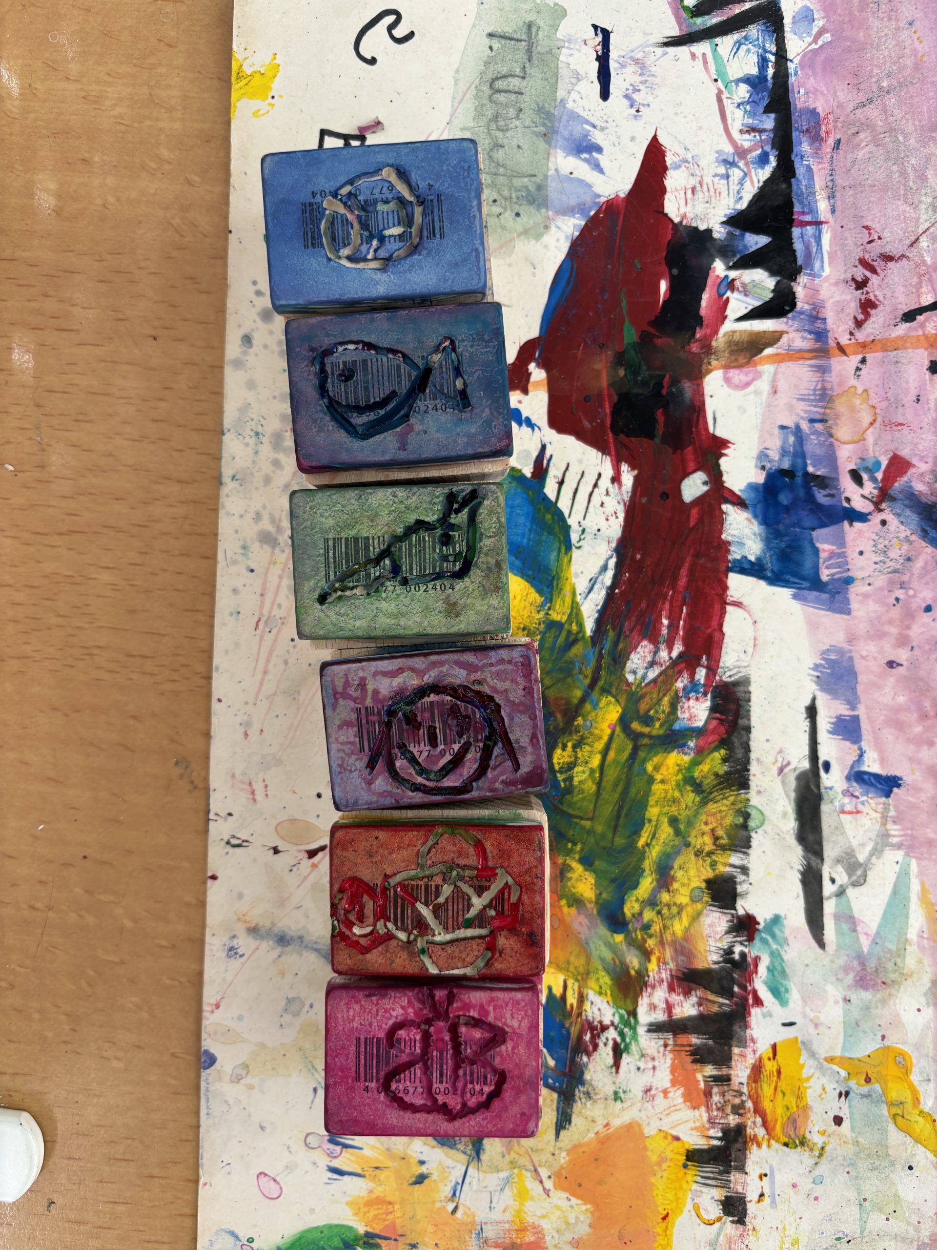 Diese wurden mit Linolschnitt-Werkzeugen aus herkömmlichen Radiergummis geschnitzt, auf Holzgriffe geleimt und sogleich ausprobiert. Alle waren begeistert von den detaillierten und bunten Ergebnissen!