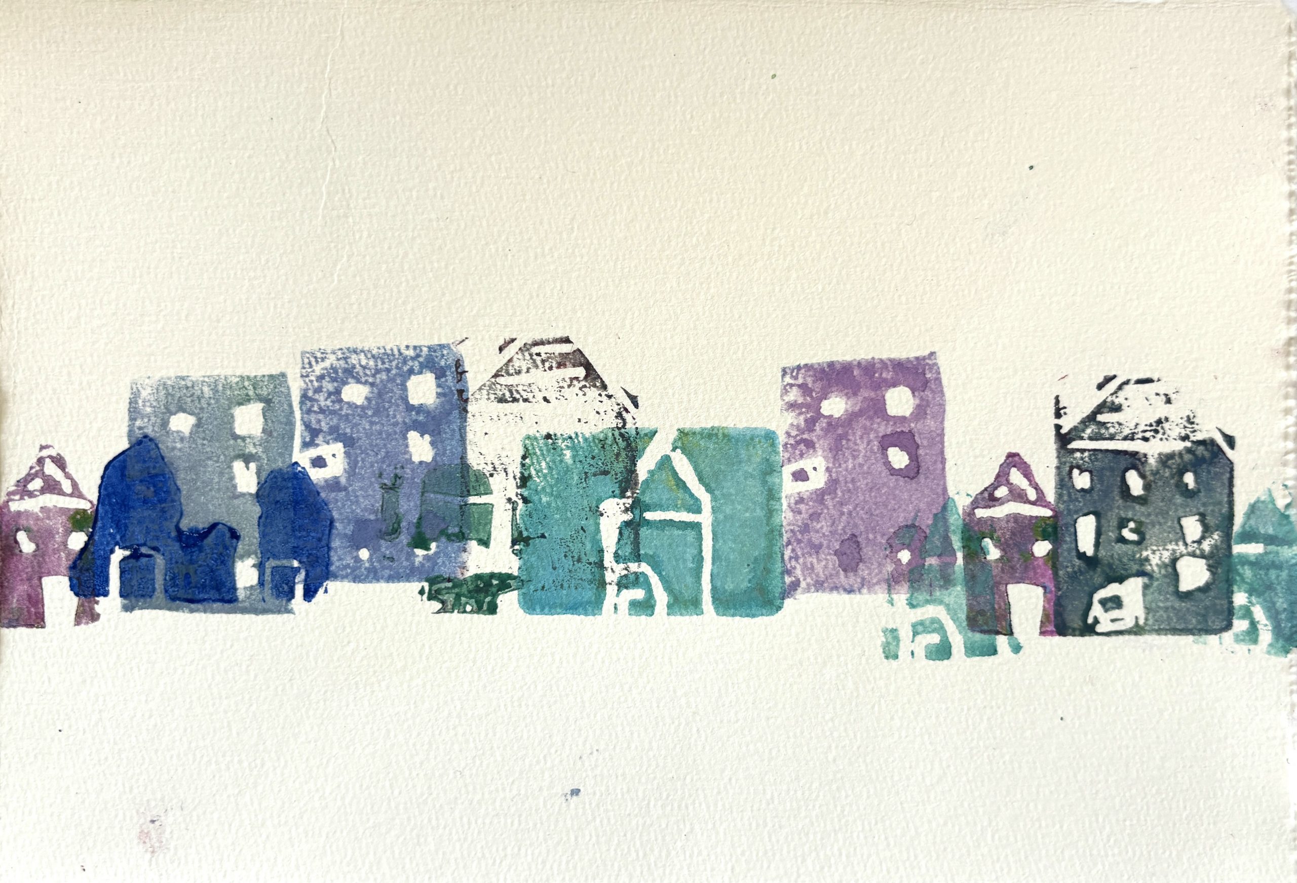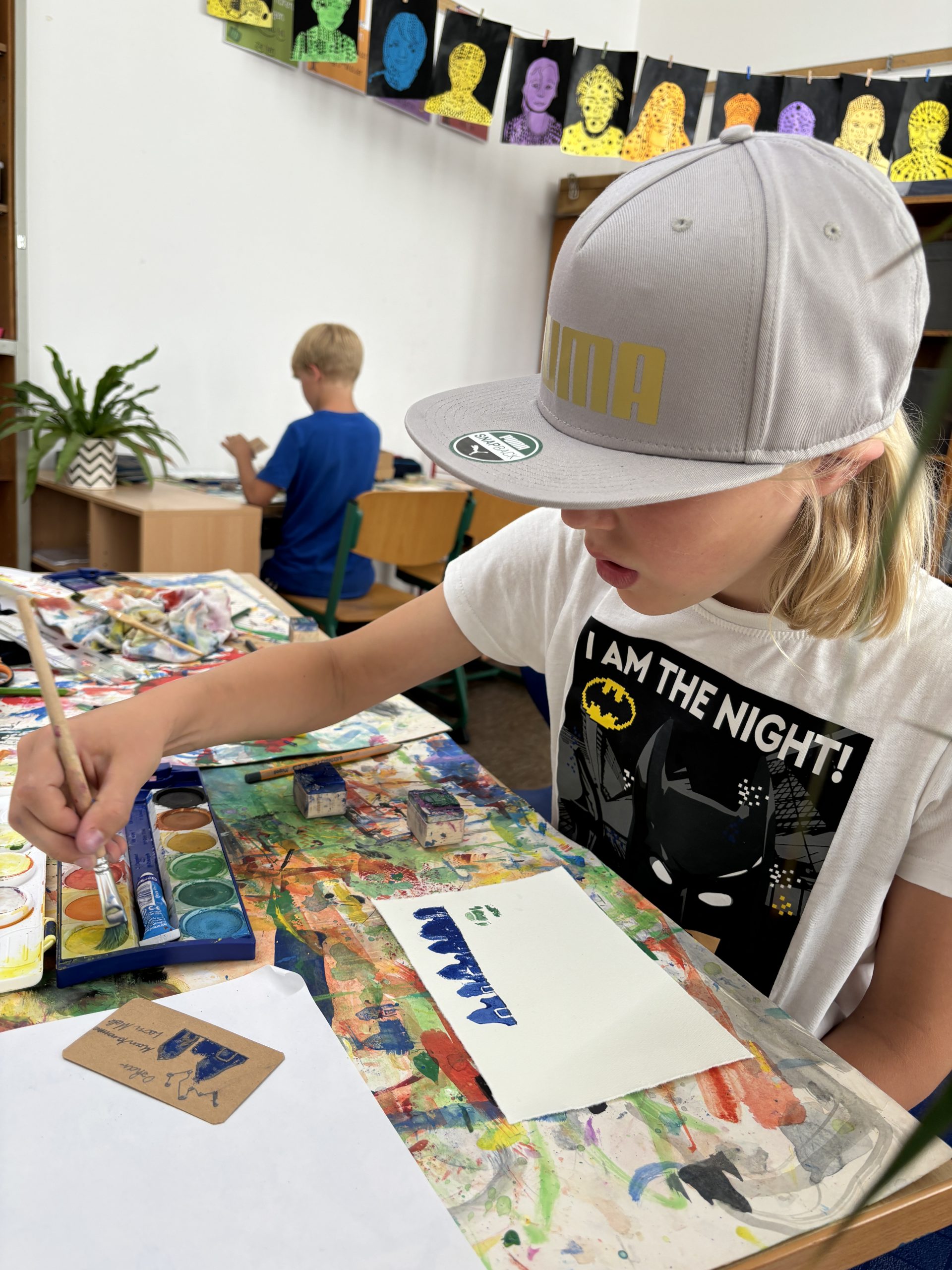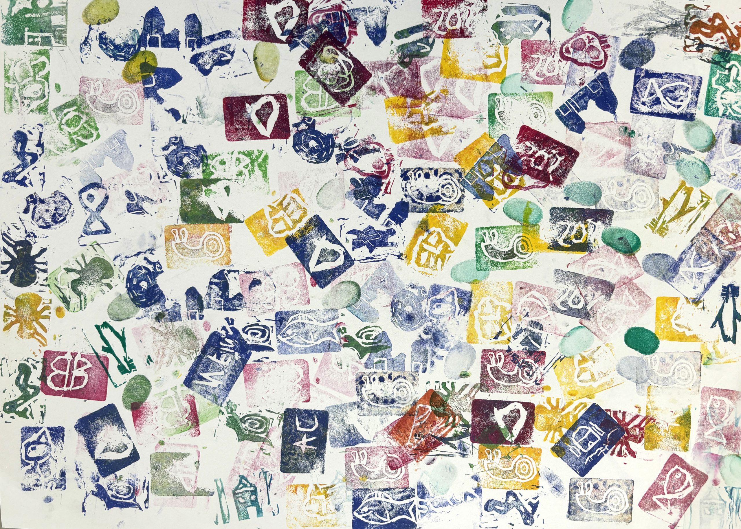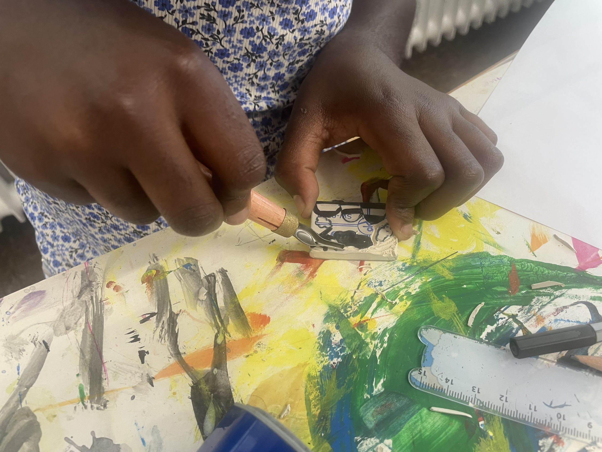 Diese wurden mit Linolschnitt-Werkzeugen aus herkömmlichen Radiergummis geschnitzt, auf Holzgriffe geleimt und sogleich ausprobiert. Alle waren begeistert von den detaillierten und bunten Ergebnissen!