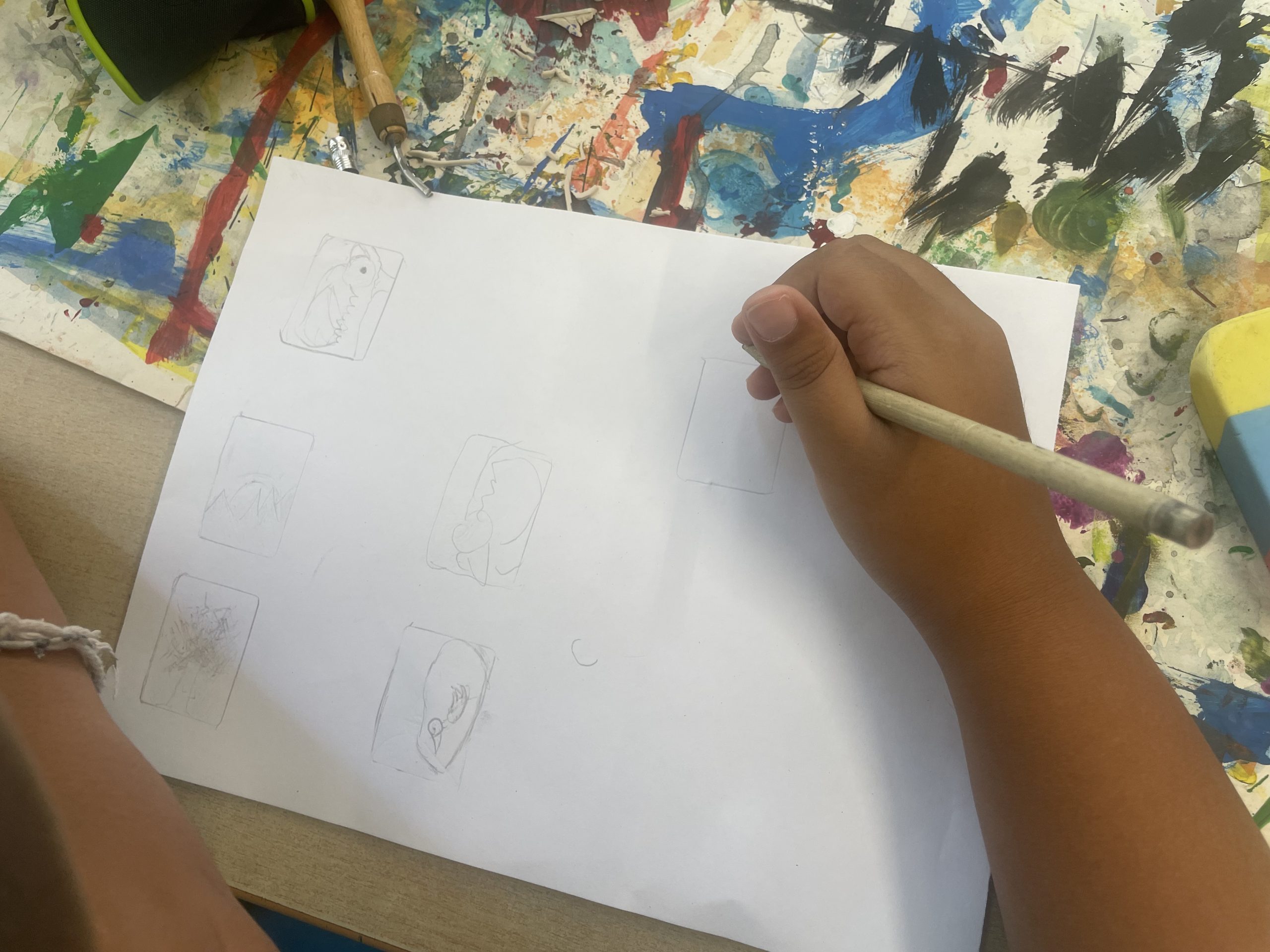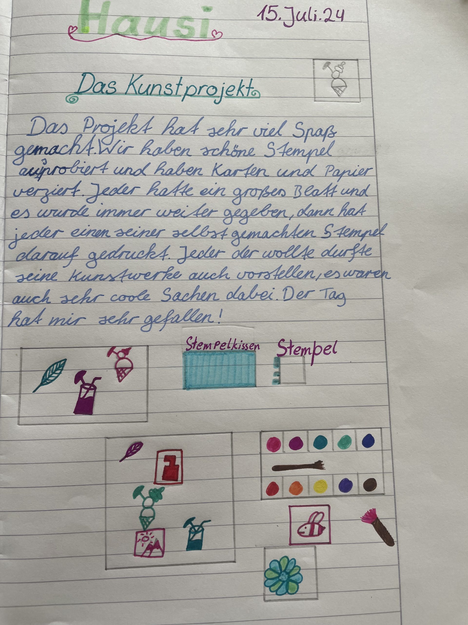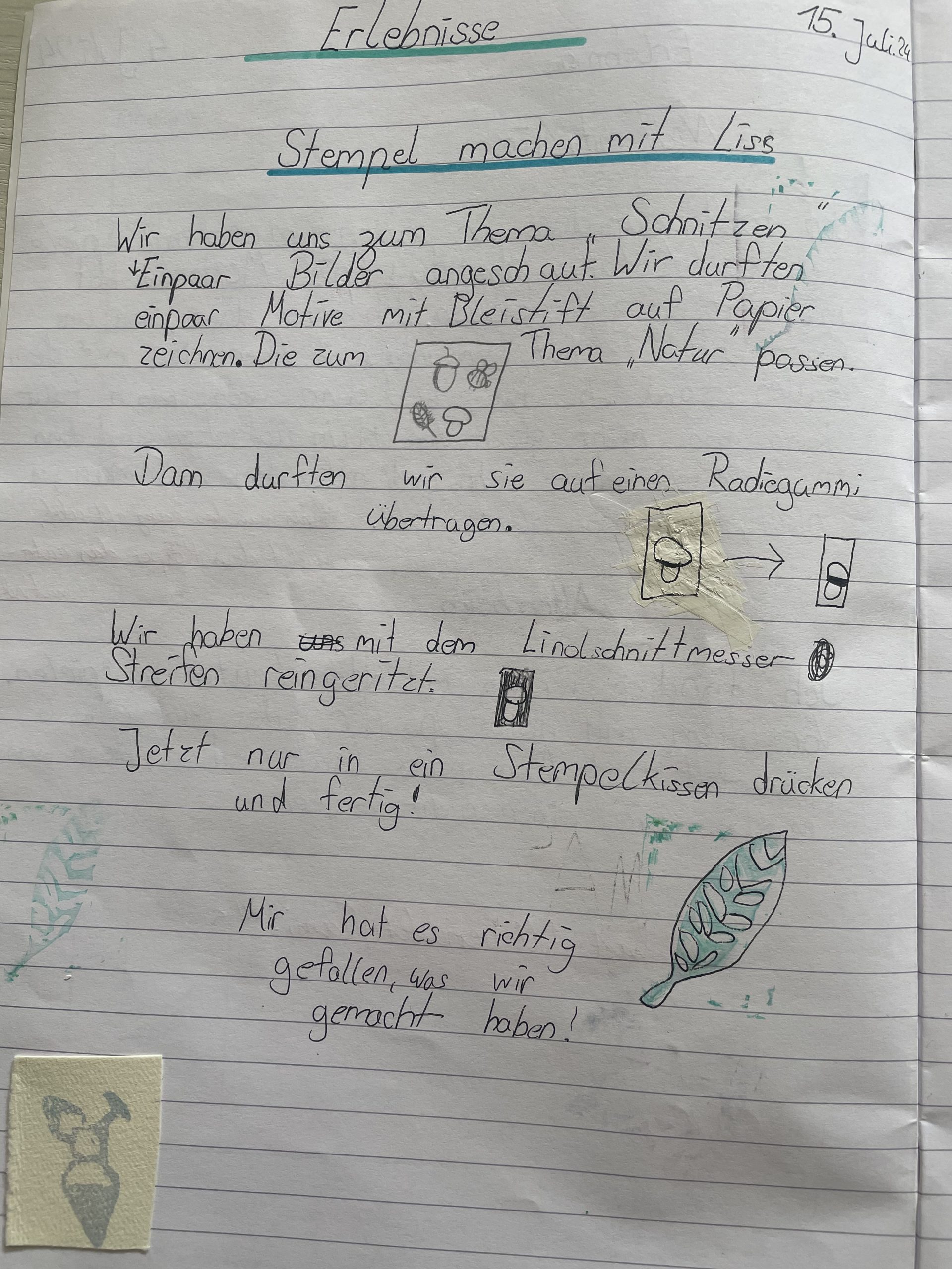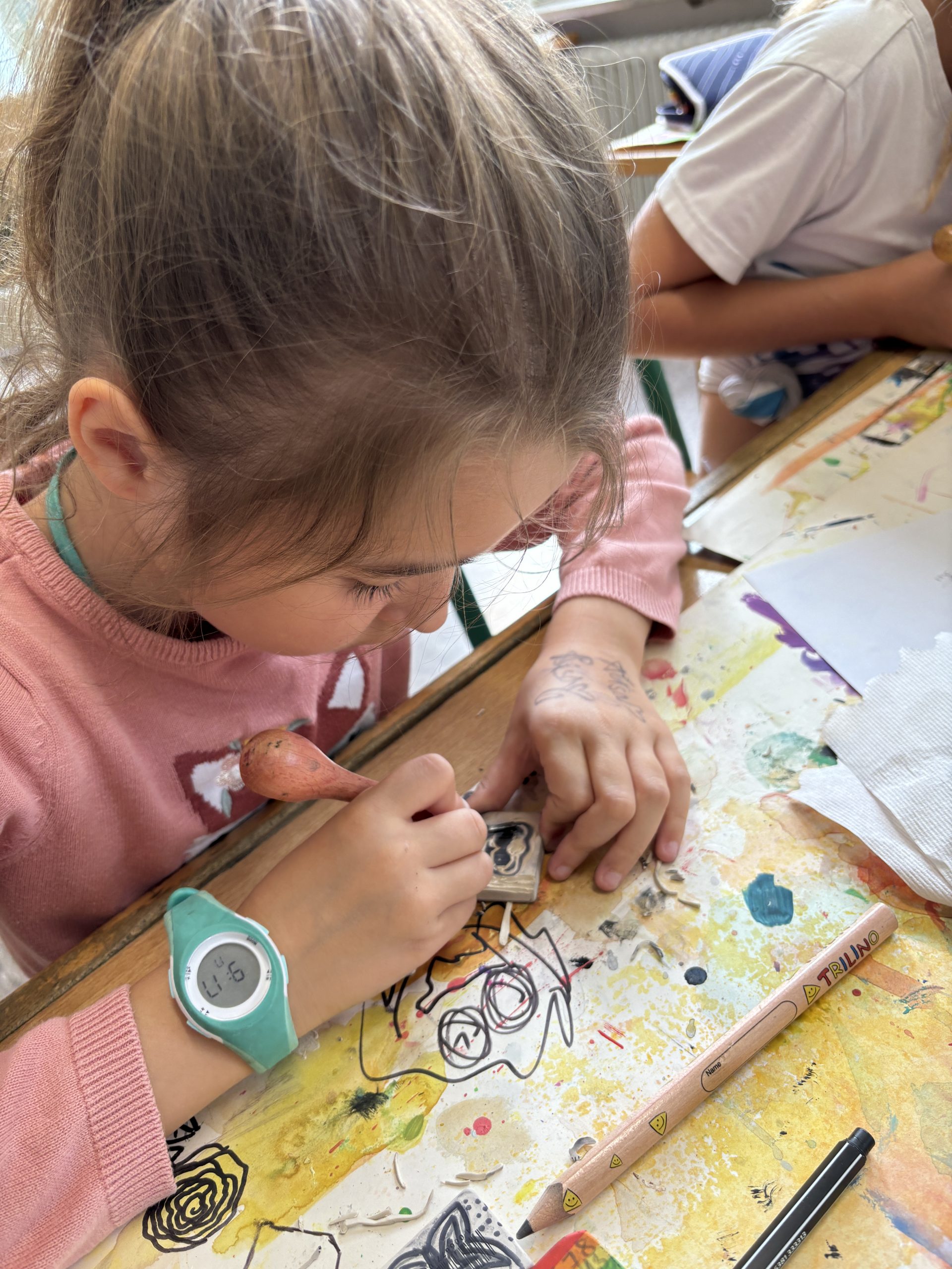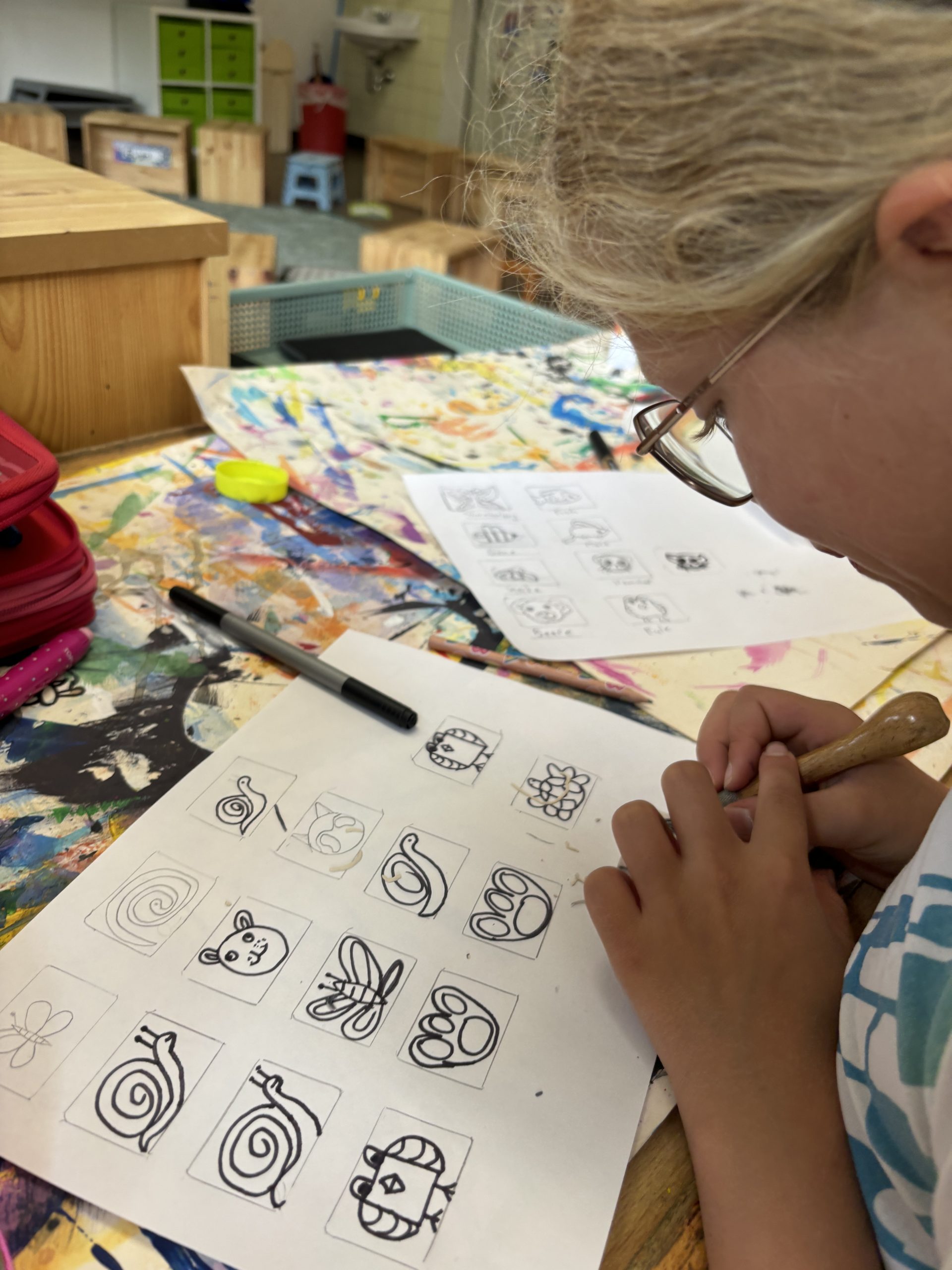 Die Kinder staunten nicht schlecht, als die Künstlerin ihre geschaffenen Skulpturen aus Holz und zahlreiche Druckgrafiken zeigte. Nachdem sich die Gruppen auf ein Thema geeinigt hatten, wurden Skizzen erstellt und schon bald entstanden die ersten handlichen Stempel.
